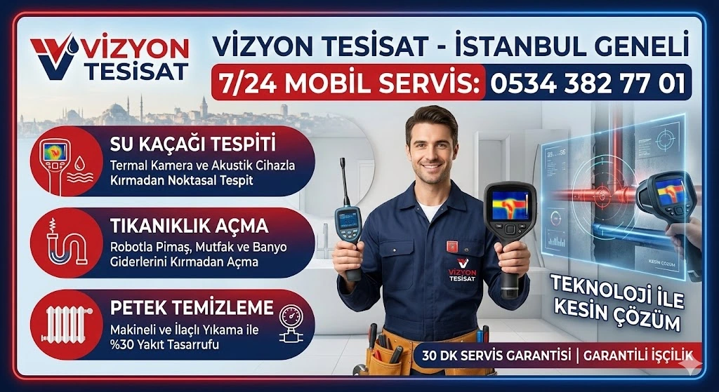 İstiklal Mahallesi Su Tesisatçısı bölgesinde Vizyon Tesisat güvencesiyle; modern cihazlarla su kaçağı tespiti, robotlu tıkanıklık açma ve profesyonel tesisat bakım